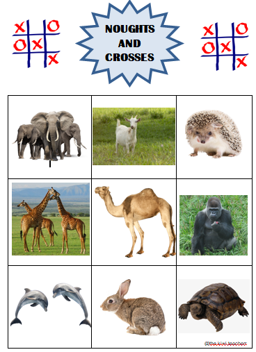 Animal noughts and crosses. It can be used in differente ways to practise speaking: describing the animal you choose, making sentences with it, etc.